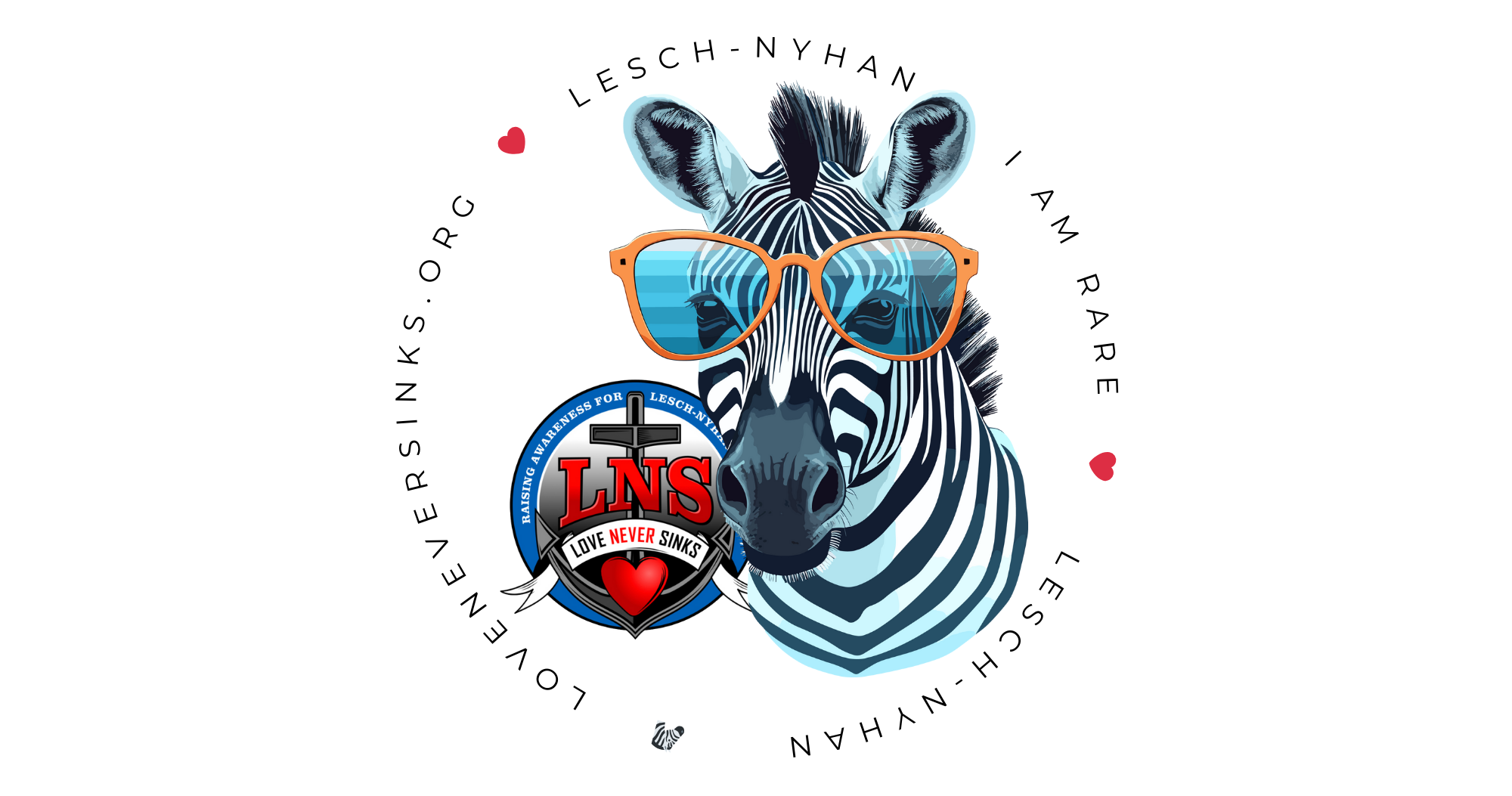 Rare Disease Zebra with Sunglasses and the Love Never Sinks Logo with a Heart and Anchor surrounded by a circle that says I am Rare. Lesch-Nyhan. Love Never Sinks.Org